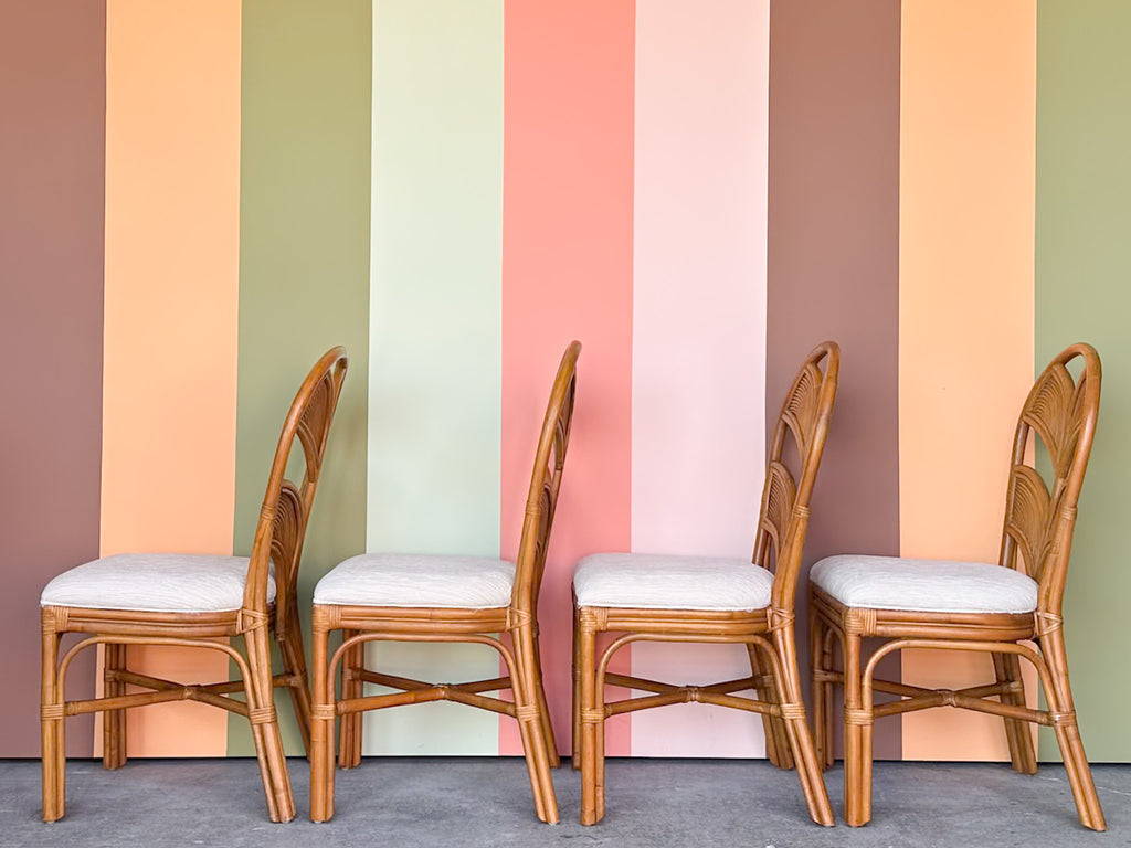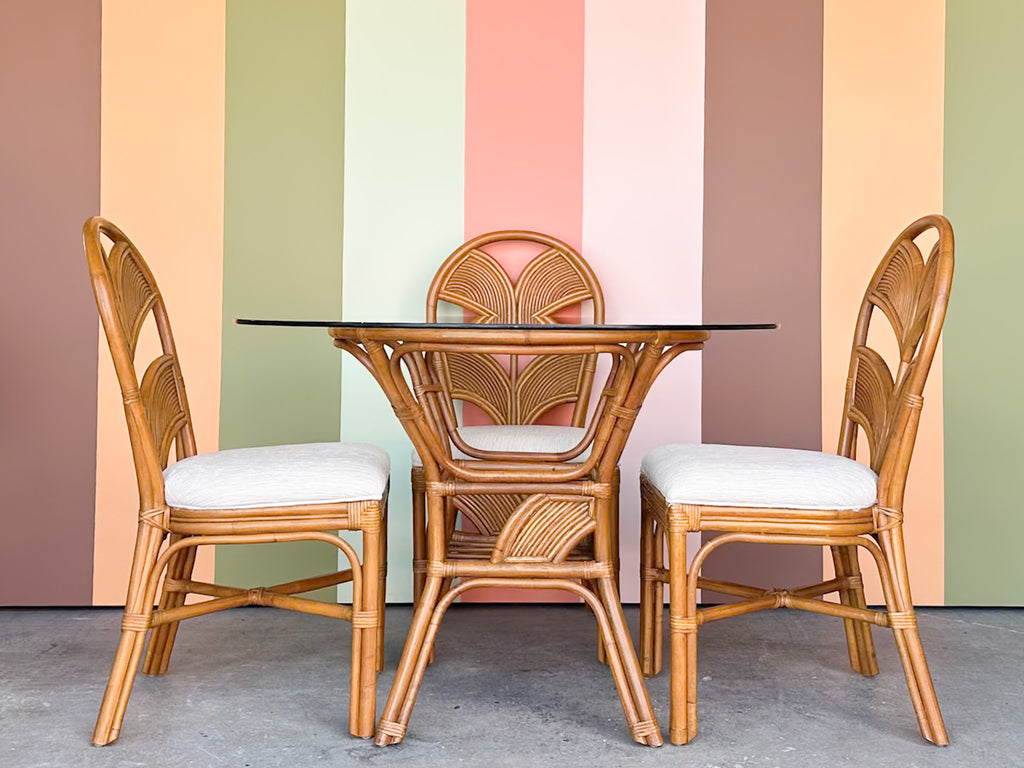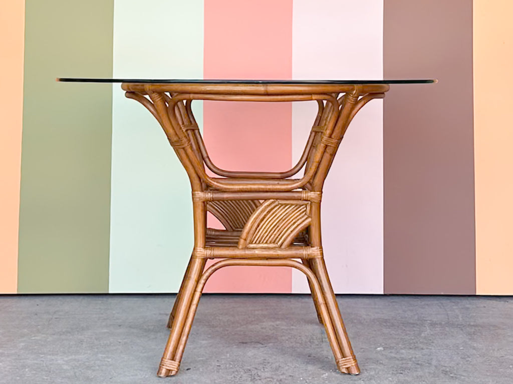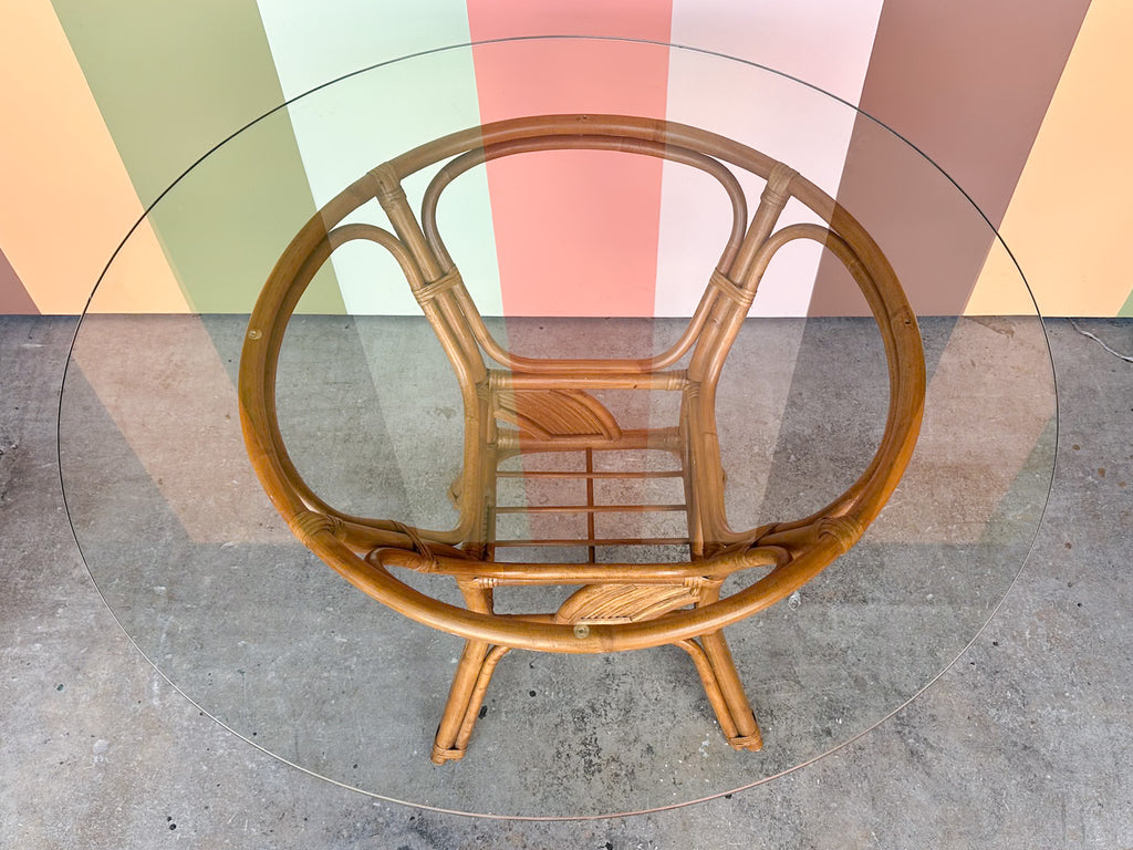 All pieces are sold in nice as found vintage condition. See photos. Dimensions: Table Base: H-29.5” W-29” L-29” Glass: H-3/8" W-42" L-42" Chair: H-38" W-20" L-18" Seat Height-20"