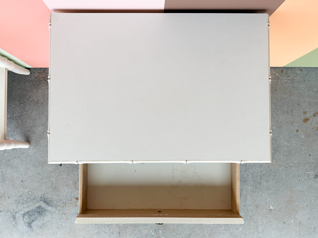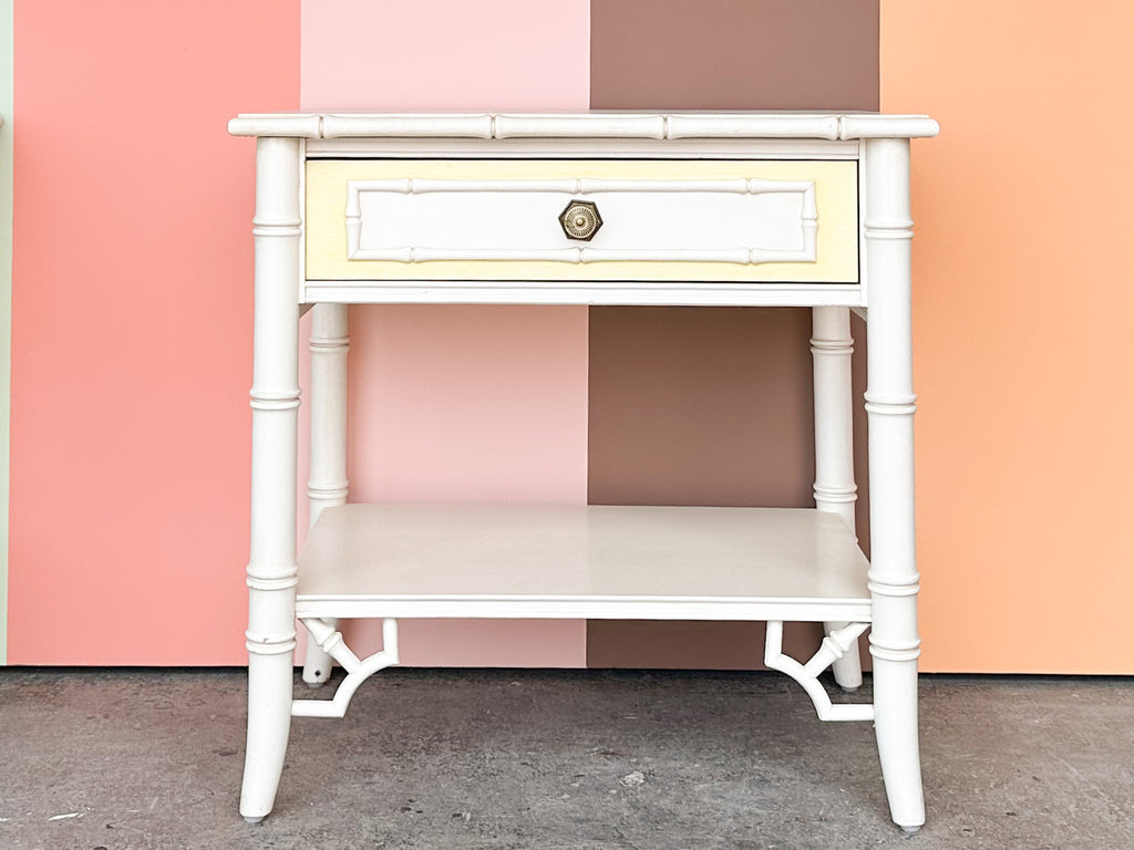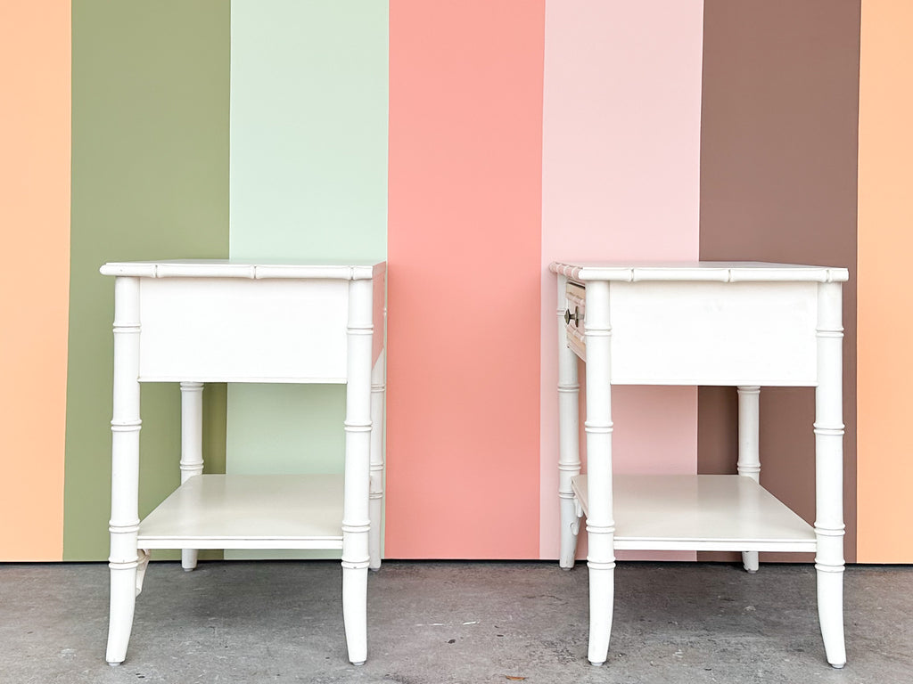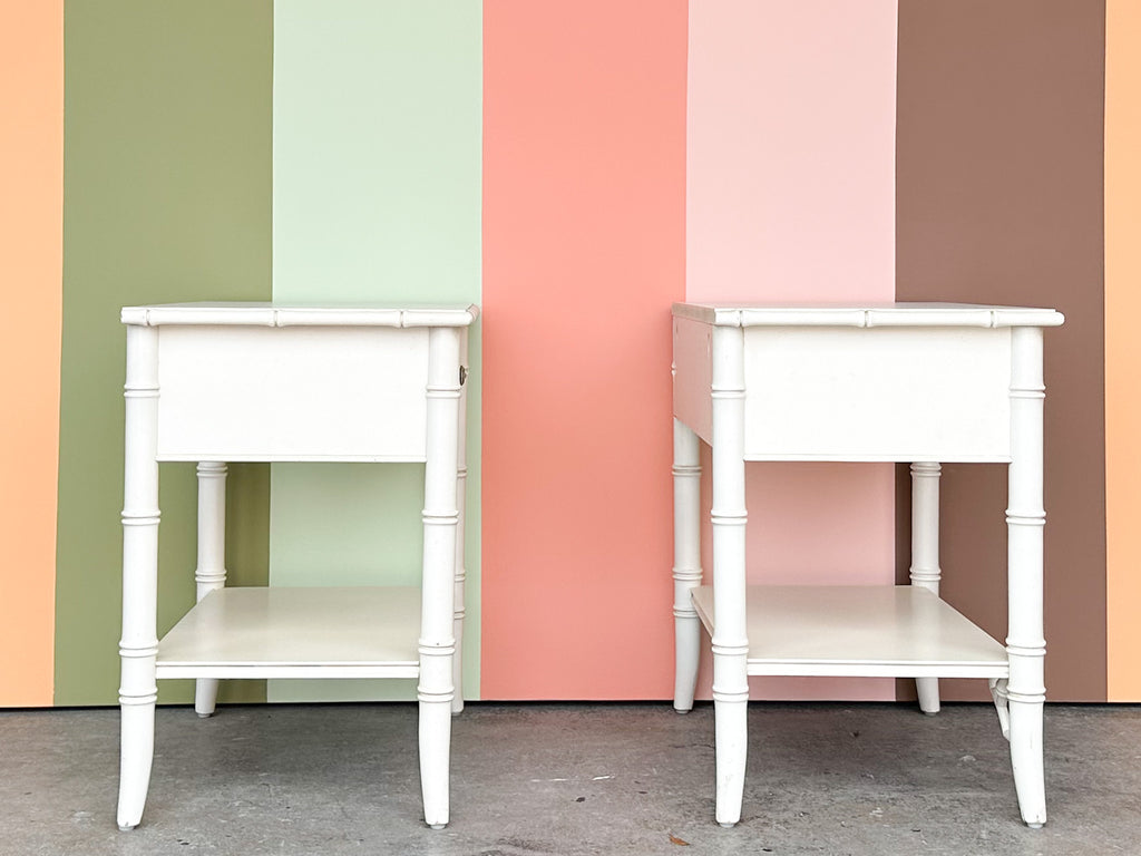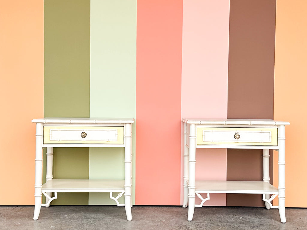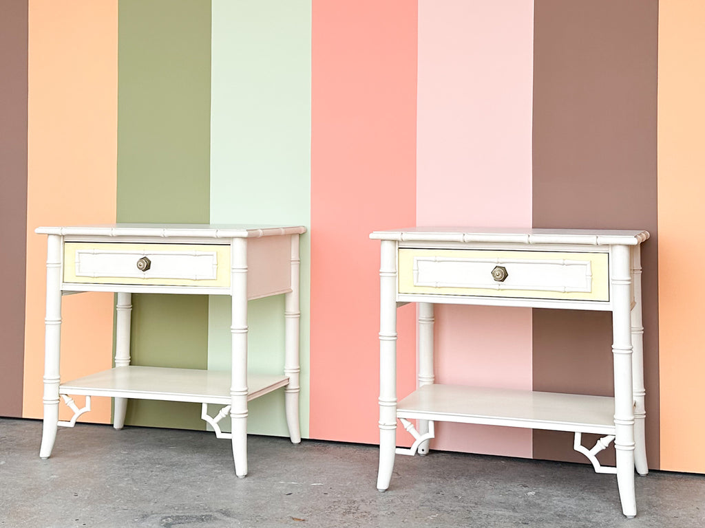 Thank you for your interest in the Pair of Thomasville Yellow and White Faux Bamboo Nightstands