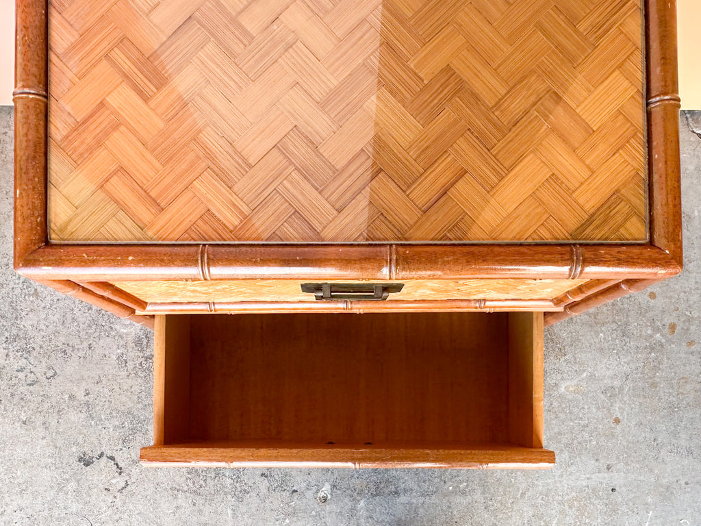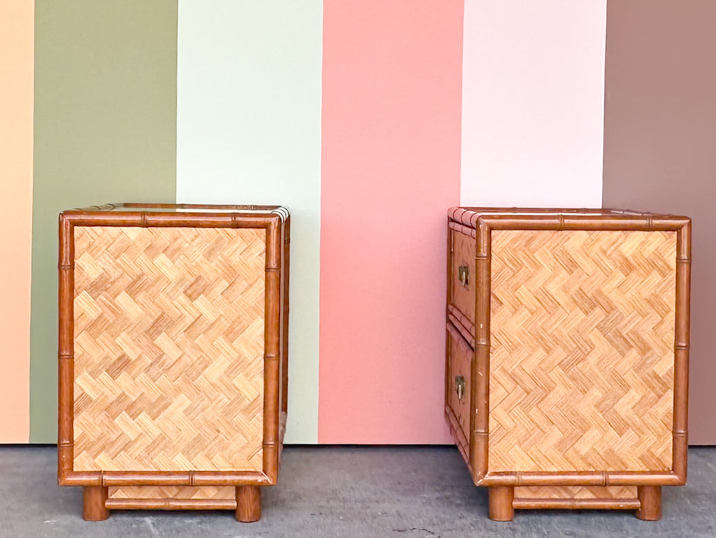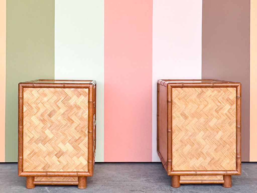 Thank you for your interest in the Pair of Old Florida Parquet Rattan Nightstands