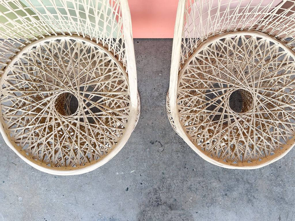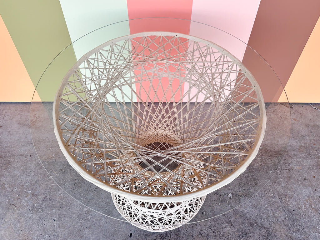 All pieces are sold in nice as found vintage condition. See photos. Dimensions: Table: H-29” W-30.5” L-30.5”Chairs: H-35" W-21" L-21" Seat H-18"Glass: 36" Round